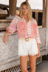 Gianna Bluse: Boho-Chic-Eleganz, florale Muster, feminine Vielseitigkeit entdecken. Dieses Modell gibt es in zwei Größen: S/M (36/38) und M/L (40/42). (Größentabelle)